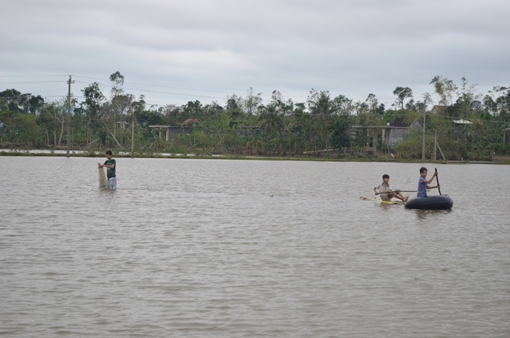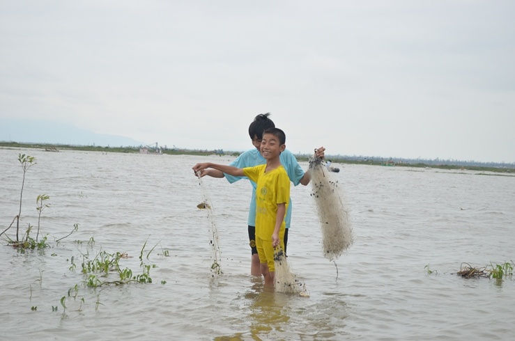 | Trẻ em tranh thủ nước rút đi giăng lưới kiếm con cá, con tôm. |