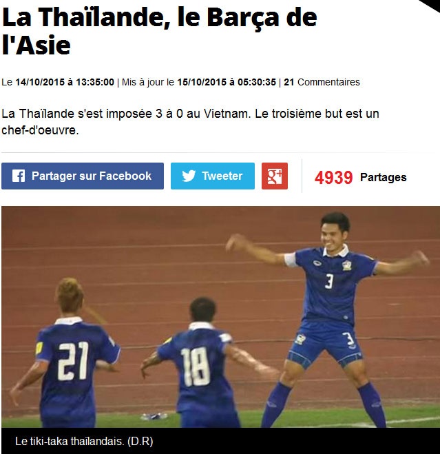 Chỉ một ngày sau khi tuyển Thái Lan đánh bại ĐT Việt Nam với tỷ số 3-0, truyền thông Pháp bất ngờ đưa tin về chiến thắng của đội tuyển xứ sở Chùa vàng. Cụ thể, trang Lequipe (Pháp) đã ví đội tuyển Thái Lan như “Barcelona châu Á”.