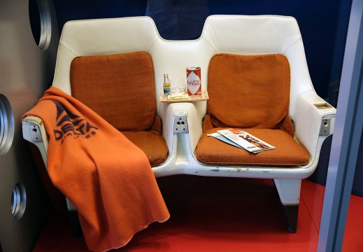Người ta giữ nguyên nội thất của những chiếc máy bay, giúp người xem có cơ hội hồi tưởng lại quá khứ. Ghế khoang hạng nhất trong những năm 1960. |