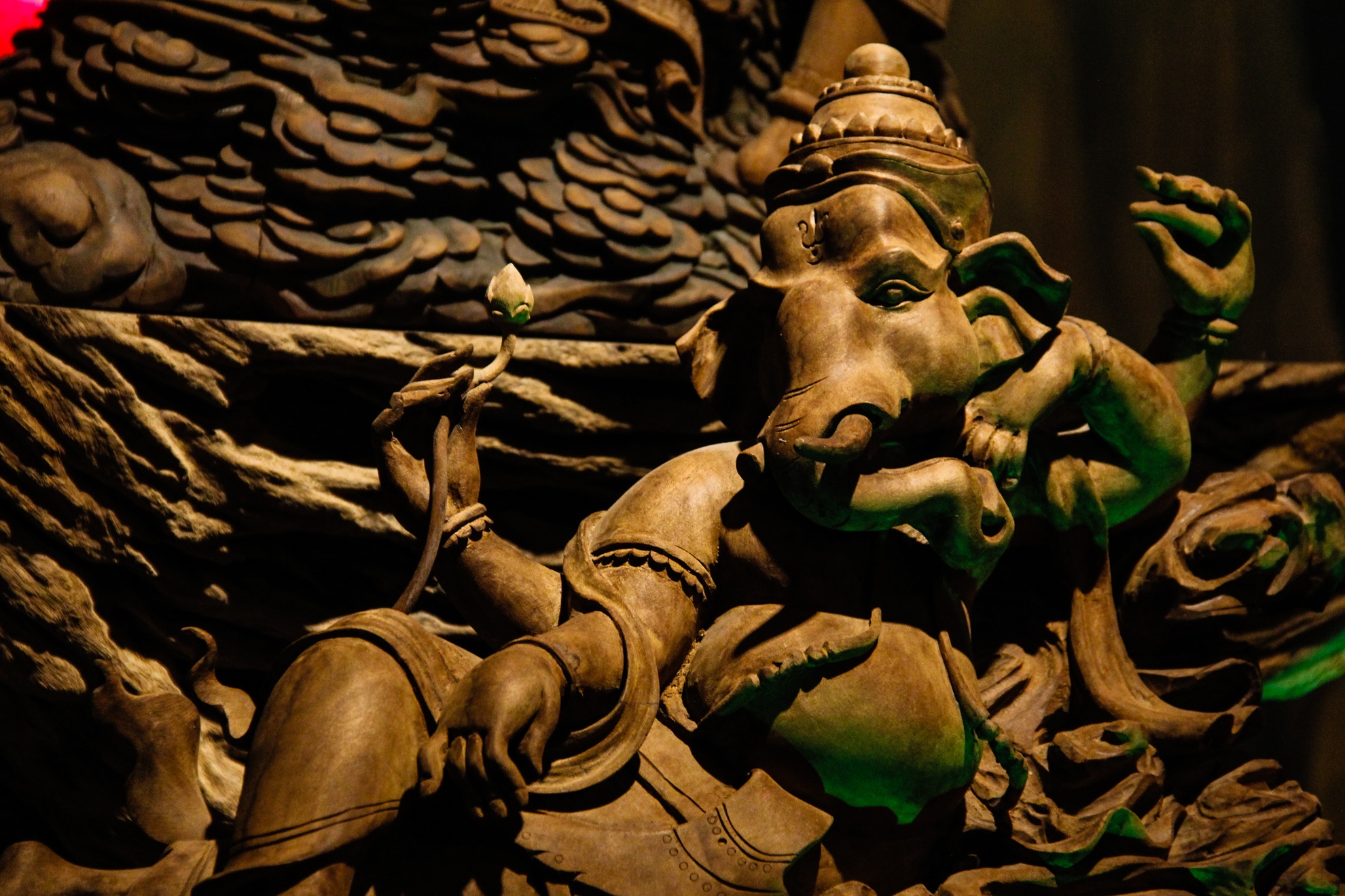 | Thần Ganesha mình người, đầu voi, tượng trưng cho sự tài trí, hạnh phúc và thành công. |