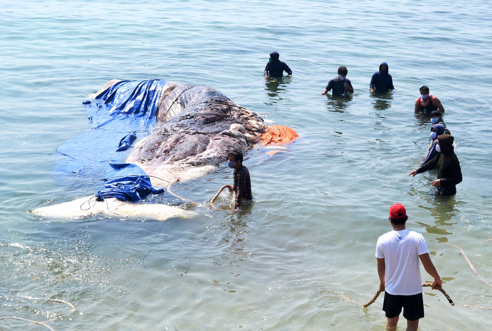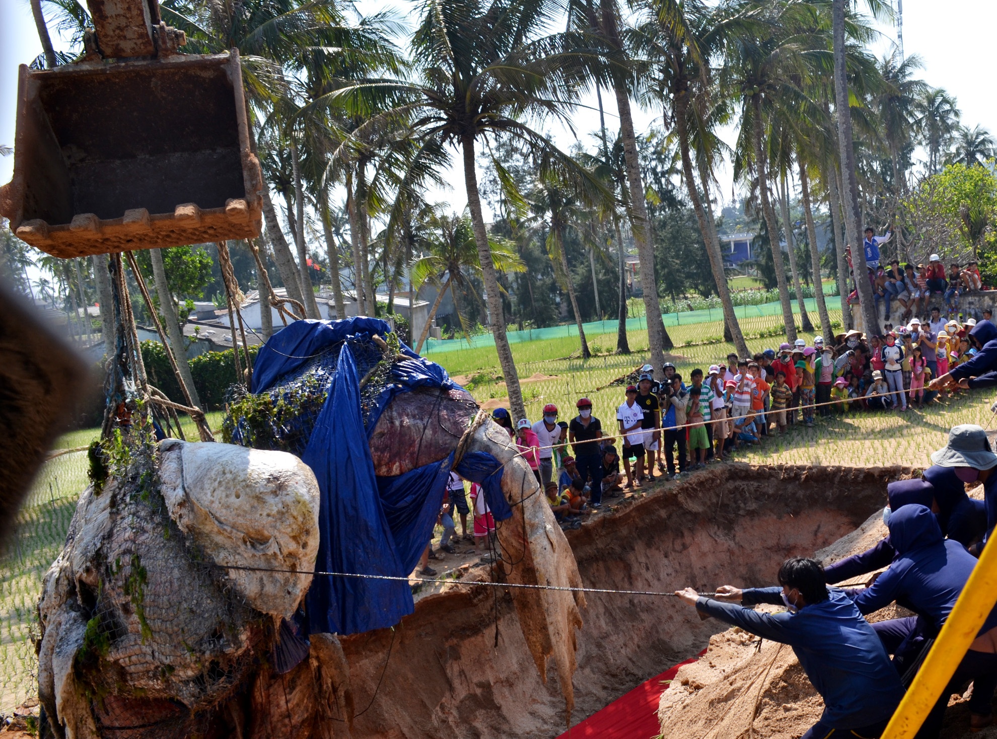 | Do trọng lượng cá voi quá lớn, chính quyền địa phương đã đề nghị một doanh nghiệp dùng cẩu chuyên dụng và huy động hàng chục thanh niên khỏe mạnh của làng chài để đưa cá voi từ biển lên bờ an táng theo nghi thức tín ngưỡng của ngư dân nơi đây. |