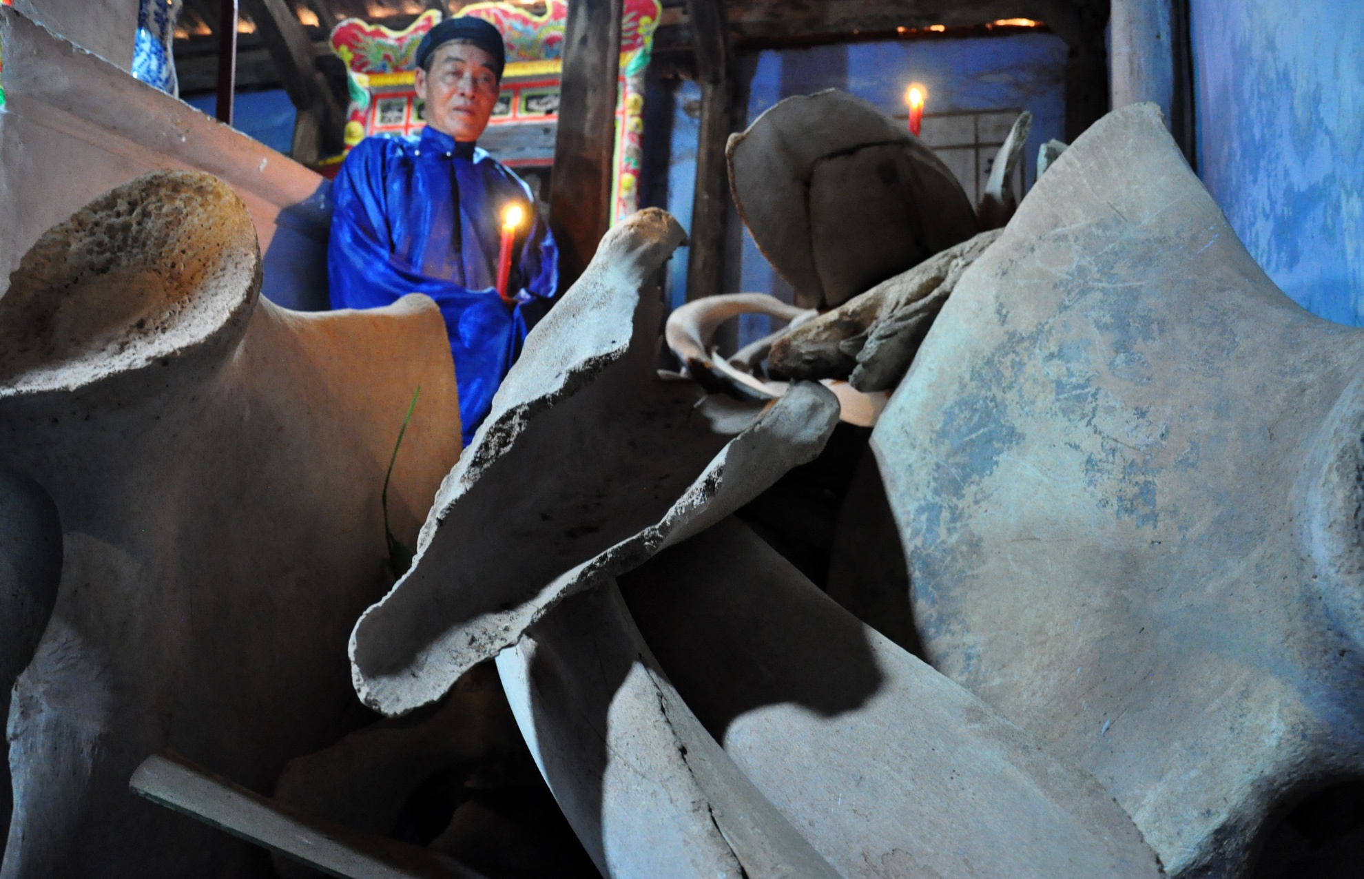 | Ông Phù Ngã- Chủ Vạn lăng Tân cho hay, ngư dân địa phương thường tín ngưỡng gọi cá voi là "ngài cá Ông". Hiện lăng Tân đang lưu giữ ba bộ hài cốt cá voi với tước vị: Đồng đình Đại vương và Đức Ngư nhị vị tôn thần. |