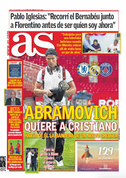 Nhật báo AS (Tây Ban Nha) thuộc phe thân Real Madrid hôm qua cho đăng tải ngay trên trang nhất 1 thông tin gây sốc: nhà tài phiệt người Nga Roman Abramovich dự định bán Hazard, Oscar và Matic để đưa Ronaldo về Stamford Bridge với giá chuyển nhượng phá kỷ lục thế giới là 71 triệu bảng (tương đương 100 triệu euro).