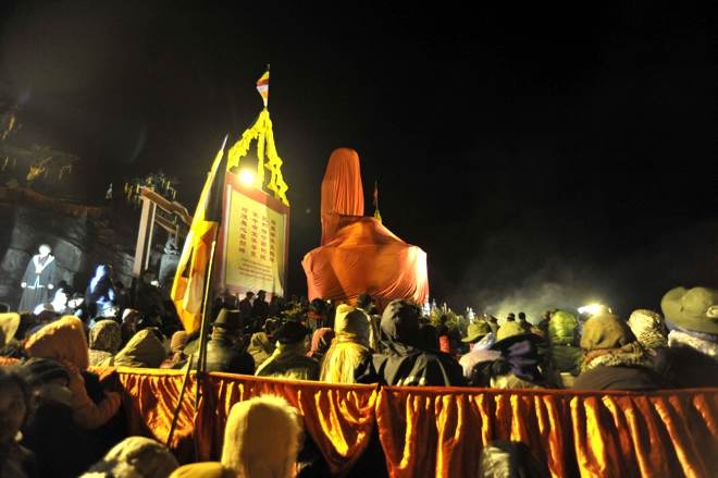 Các Phật tử và người dân xếp hàng từ 5h sáng để chờ đợi giây phút hô thần nhập tượng tại lễ khánh thành.