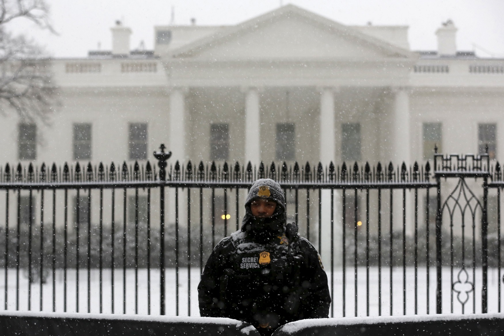 | Một vệ sĩ canh gác bên ngoài Nhà Trắng dưới trời tuyết rơi. Ảnh: Reuters |