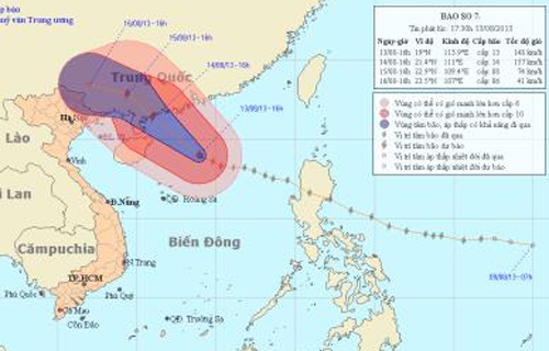 Hồi 16 giờ ngày 13/8, vị trí tâm bão ở vào khoảng 19,0 độ Vĩ Bắc; 113,9 độ Kinh Đông. Cách quần đảo Hoàng Sa khoảng 300 km về phía Đông Đông Bắc. Sức gió mạnh nhất ở vùng gần tâm bão mạnh cấp 13, cấp 14 (tức là từ 134 đến 166km một giờ), giật cấp 16, cấp 17.