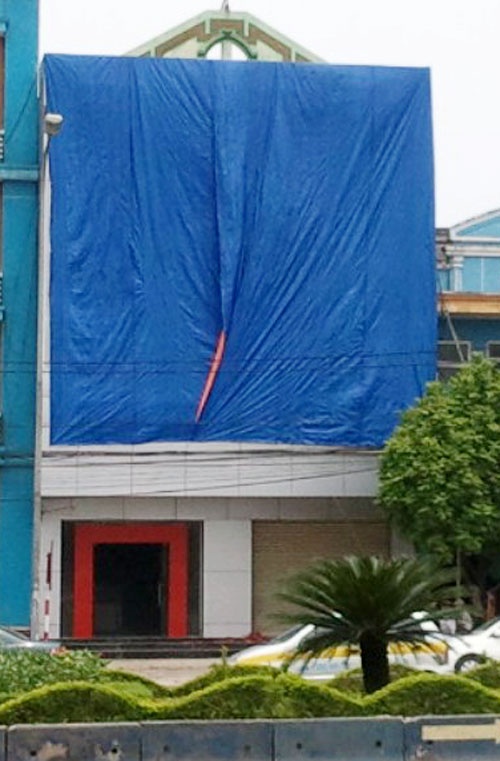 | Sau khi công an khám nghiệm hiện trường, ngân hàng đã cho che bạt toàn bộ mặt tiền trụ sở. |