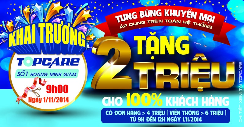 Nhân dịp này, hệ thống Topcare quyết định tung ra đợt khuyến mại lớn nhất từ trước tới nay về cả số lượng lẫn giá trị khuyến mại: Tặng 2 triệu đồng cho 100% khách hàng có đơn hàng trên 4 triệu đồng (viễn thông: trên 6 triệu đồng) trên toàn hệ thống, trong ngày Topcare 1 Hoàng Minh Giám khai trương - thứ bảy ngày 1/11.