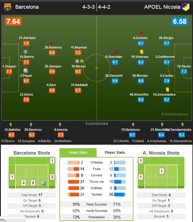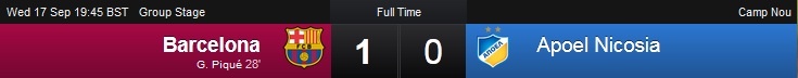 Trận đấu giữa Barca và APOEL kết thúc với tỷ số chung cuộc 1-0 nghiêng về đội bóng xứ Catalunya.