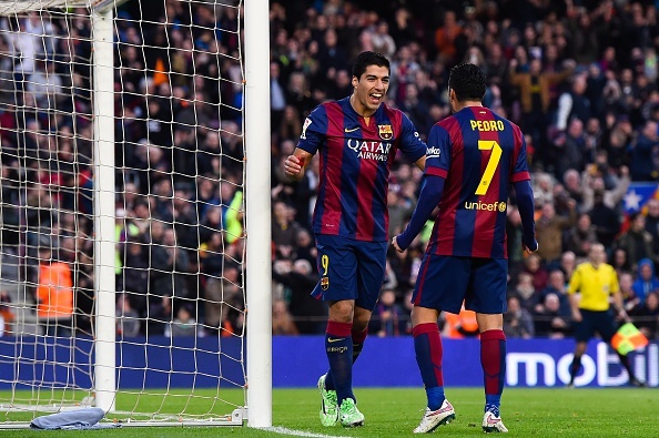 Suarez chia sẻ niềm vui với đồng đội kiến tạo Pedro. Ảnh: Getty Images.