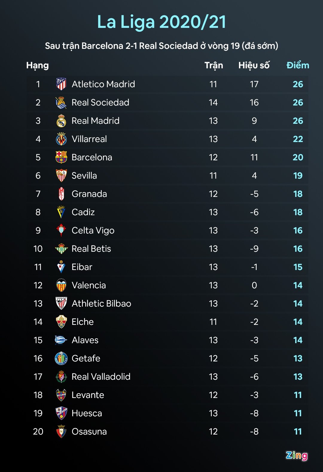 | Kết quả này giúp Barca vươn lên vị trí thứ 5, trong khi Sociedad bị đẩy xuống thứ 2, do kém Atletico Madrid về chỉ số phụ. Sau 13 trận đã đấu, Messi cùng đồng đội kém vị trí dẫn đầu 6 điểm. |