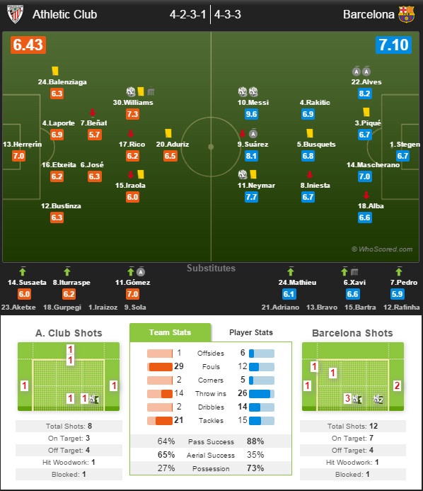 +Barcelona: Ter Stegen, Alvez, Pique, Mascherano, Alba, Rakitic, Busquets, Iniesta, Messi, Suarez, Neymar.