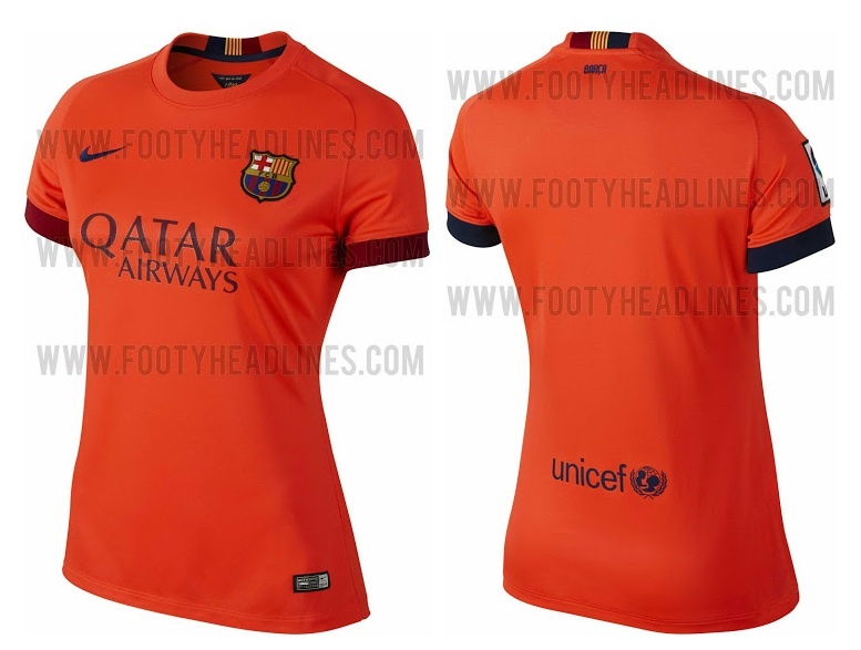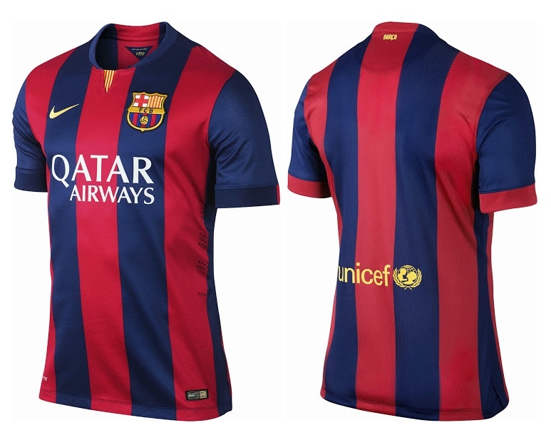 Mẫu áo của Barca mùa 2014/15 vẫn do Nike thiết kế và sản xuất. Trên ngực áo in tên nhà tài trợ Qatar Airways, phía sau lưng là tổ chức Unicef (Barca quảng cáo miễn phí). Bộ cánh mới vẫn dựa trên tông màu truyền thống sọc xanh-đỏ. Điểm khác biệt duy nhất giữa áo mới với áo cũ là lần đầu tiên xuất hiện màu cờ xứ Catalunya trước cổ áo.