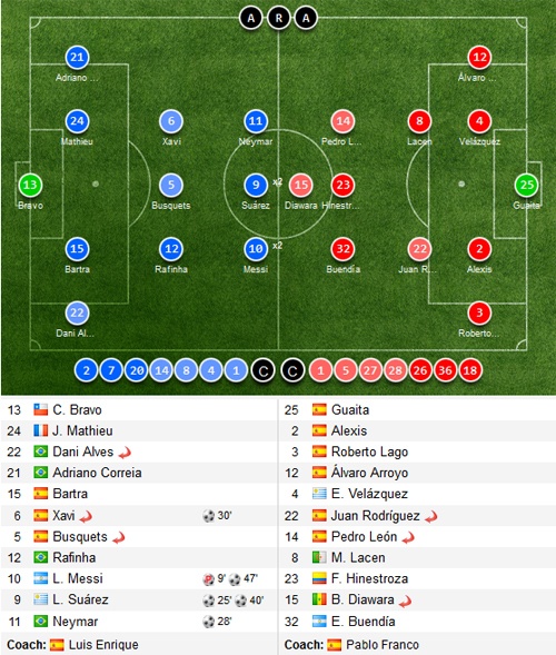 Trong hiệp 1, đội chủ nhà có thêm hai bàn thắng do công của Xavi (30') và Suarez (40').