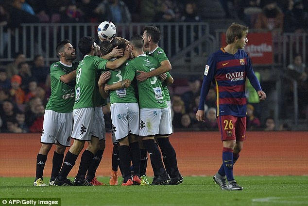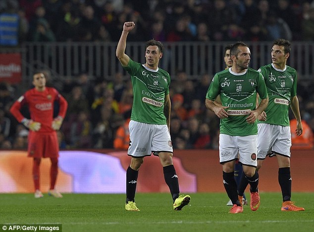 Juanfran (giơ tay) vui mừng khi ghi bàn vào lưới nhà đương kim vô địch của giải ngay tại thánh đường Nou Camp. Tuy nhiên, đây cũng chỉ là bàn danh dự, bởi sau đó mành lưới của Villanovense rung thêm 4 lần nữa.