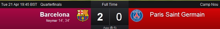 PSG được tăng cường sức mạnh khi Ibrahimovic và Verratti trở lại sau án phạt thẻ. Tuy nhiên, hai ngôi sao này không thể giúp CLB của Pháp tránh nhận thất bại thêm một lần nữa trước Barca. Tiền đạo Neymar trở thành khắc tinh của PSG khi sút tung lưới thủ môn Sirigu hai lần ở phút 14 và 34. Chiến thắng 2-0 trong trận lượt về tứ kết Champions League giúp gã khổng lồ xứ Catalan giành quyền đi tiếp với tỷ số chung cuộc 5-1 (lượt đi Barca thắng 3-1).