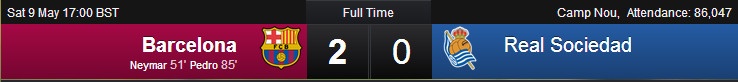 Barca chỉ có thể khai thông thế bế tắc ở phút 51. Messi thực hiện đường chuyền thông minh để Neymar dễ dàng đánh đầu cận thành tung lưới đội khách Đến phút 85, lại là Leo căng ngang, bóng bị hậu vệ Sociedad cản phá đến đúng vị trí của Pedro. Ở tư thế xoay lưng với khung thành nhưng tiền đạo đội chủ nhà vẫn tung người móc bóng ngẫu hứng hạ gục thủ thành Rulli.