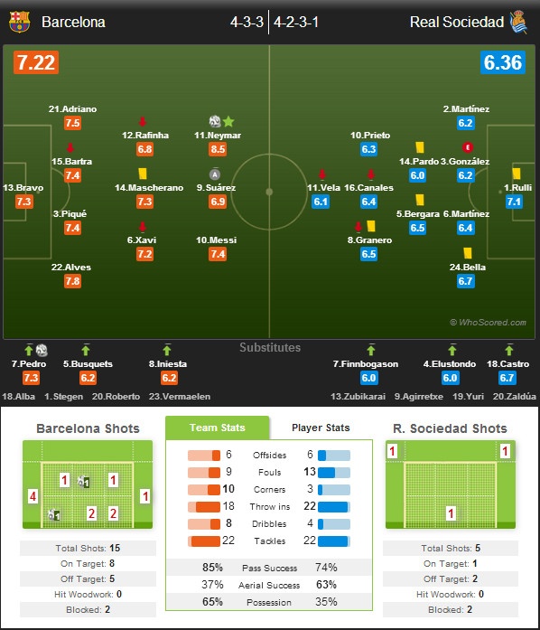 Dư vị chiến thắng ấn tượng 3-0 trước Bayern Munich tại đấu trường châu Âu giúp Barca nhập cuộc hưng phấn trong cuộc tiếp đón Real Sociedad. Đội chủ sân Nou Camp tạo ra thế trận áp đảo toàn diện nhưng cũng phải chờ tới các pha lập công trong hiệp 2 của Neymar và Pedro để giành 3 điểm quan trọng.