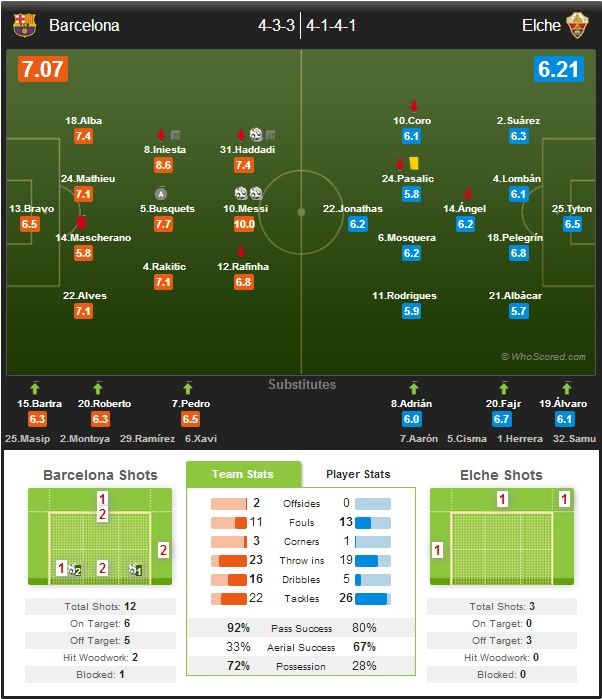 Trong 45 phút đầu tiên, Barcelona dễ dàng kiểm soát thế trận và tạo ra khá nhiều pha dứt điểm khiến khung thành Elche chao đảo. Và bàn thắng của Leo Messi chỉ đến như một kết cục tất yếu. Tuy nhiên, đội chủ nhà lại bất ngờ rơi vào thế bất lợi khi trung vệ Mascherano bị truất quyền thi đấu chỉ 1 phút sau khi Messi mở tỷ số.