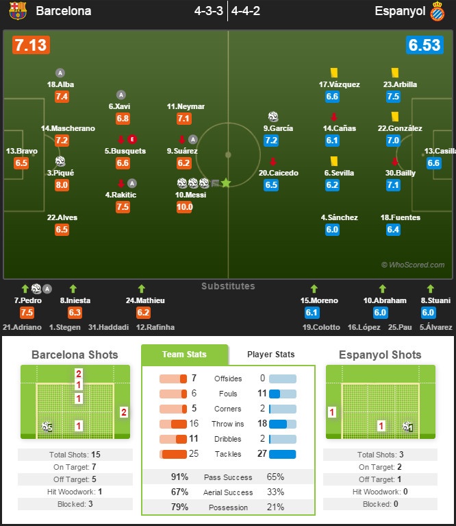 50': Từ đường chuyền của Suarez, Messi xâu kim một hậu vệ Espanyol trước khi thực hiện cú sút chân phải chính xác mang về bàn thắng nâng tỷ số lên 2-1.