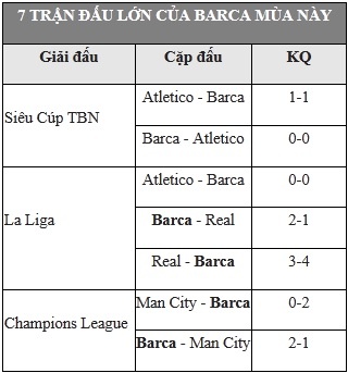 Bản lĩnh ở các trận đấu lớn là nguyên nhân quan trọng giúp Barca đang rất vững vàng ở cả 3 mặt trận. Đó cũng là điểm tựa để thầy trò HLV Gerardo Martino hy vọng bội thu danh hiệu vào cuối mùa. Cụ thể, Barca bất bại cả 7 trận đấu lớn trước các CLB trong Top 3 thuộc 5 giải VĐQG hàng đầu châu Âu mùa này: 3 trận hòa và 4 chiến thắng.
