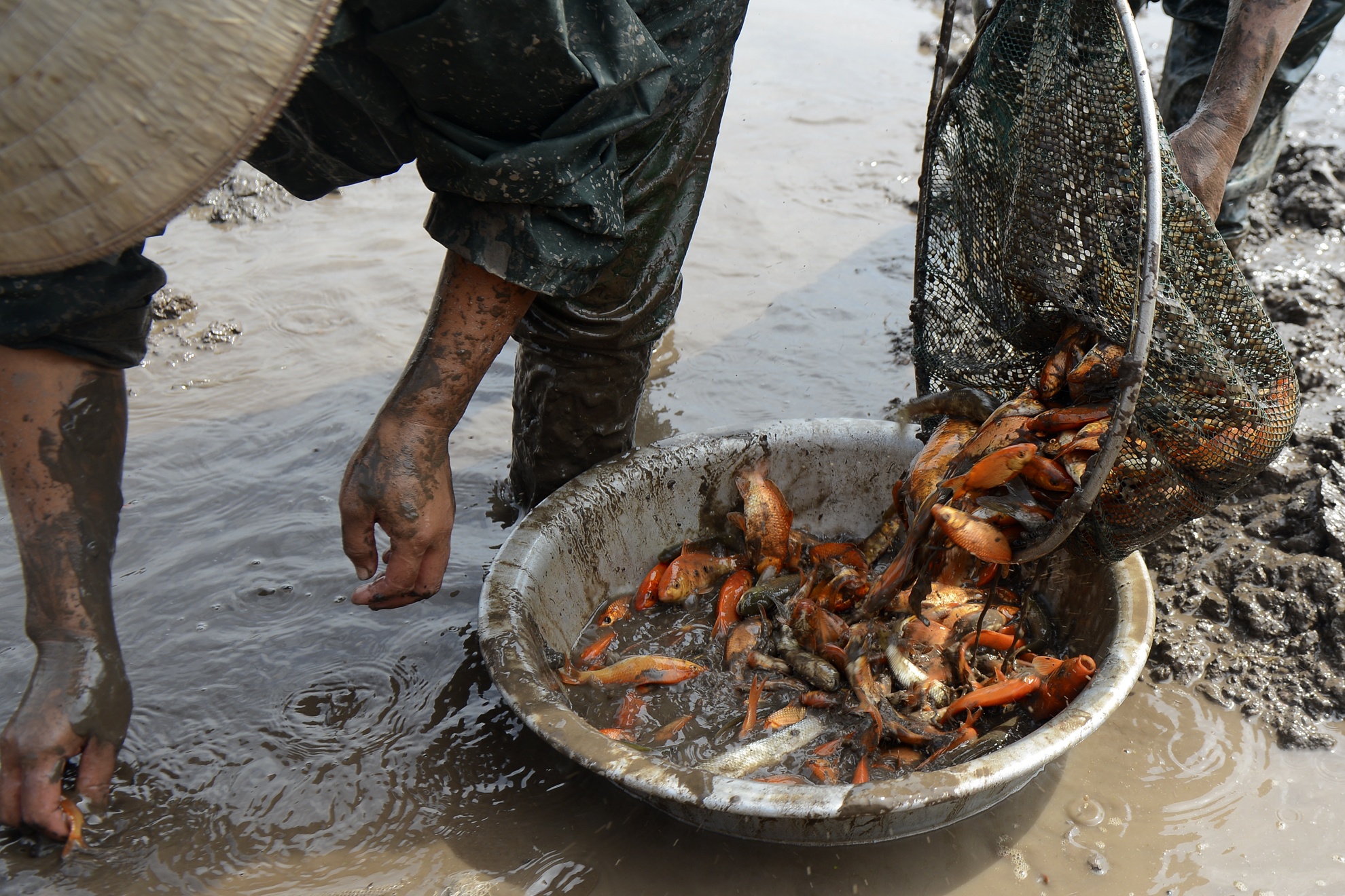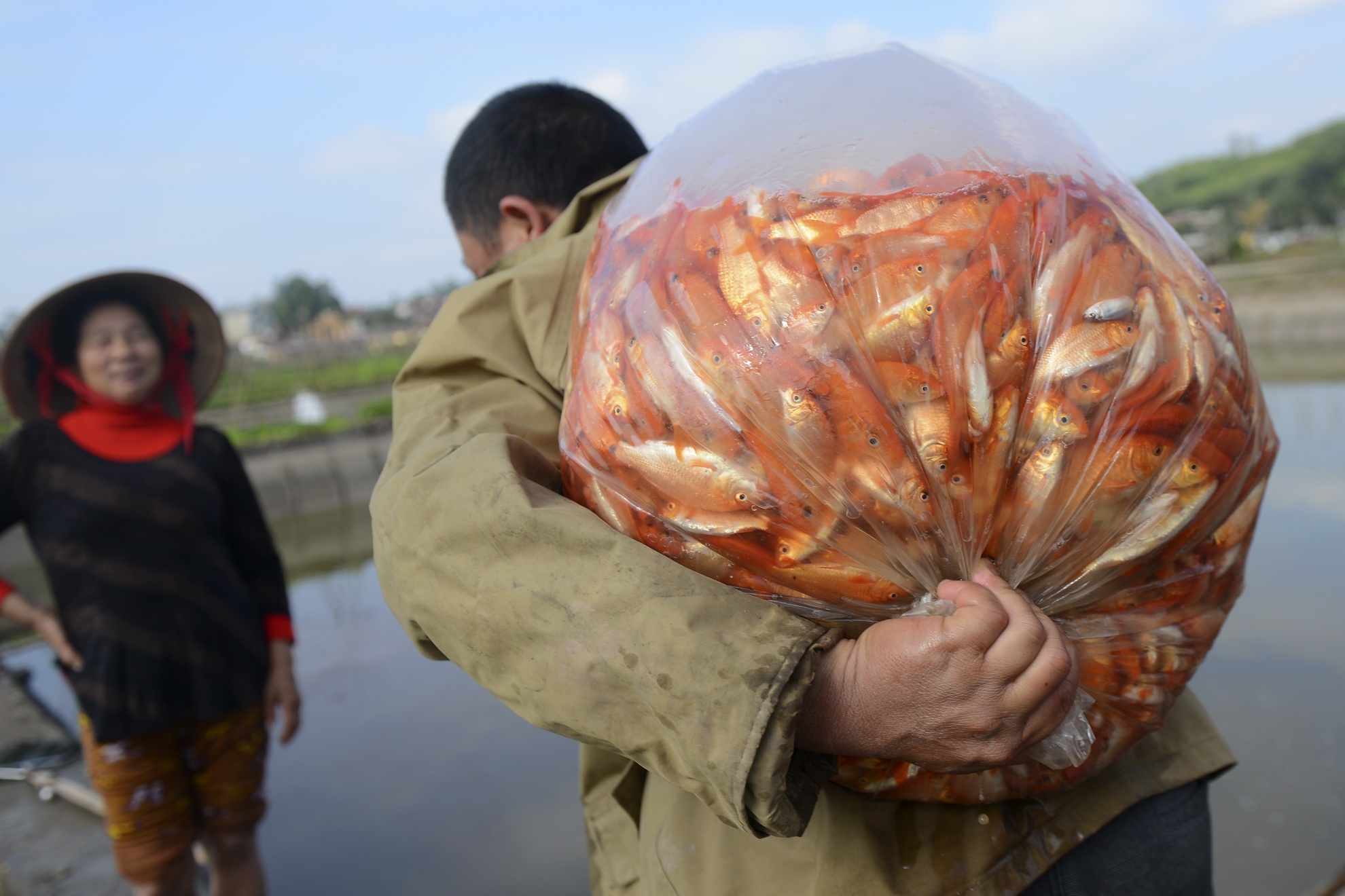 | Làng nghề Thủy Trầm (Tuy Lộc, Cẩm Khê, Phú Thọ) những ngày này nhộn nhịp cảnh tát ao bắt cá chép đỏ phục vụ khách hàng làm lễ tiễn Táo quân chầu trời ngày 23 tháng Chạp. |