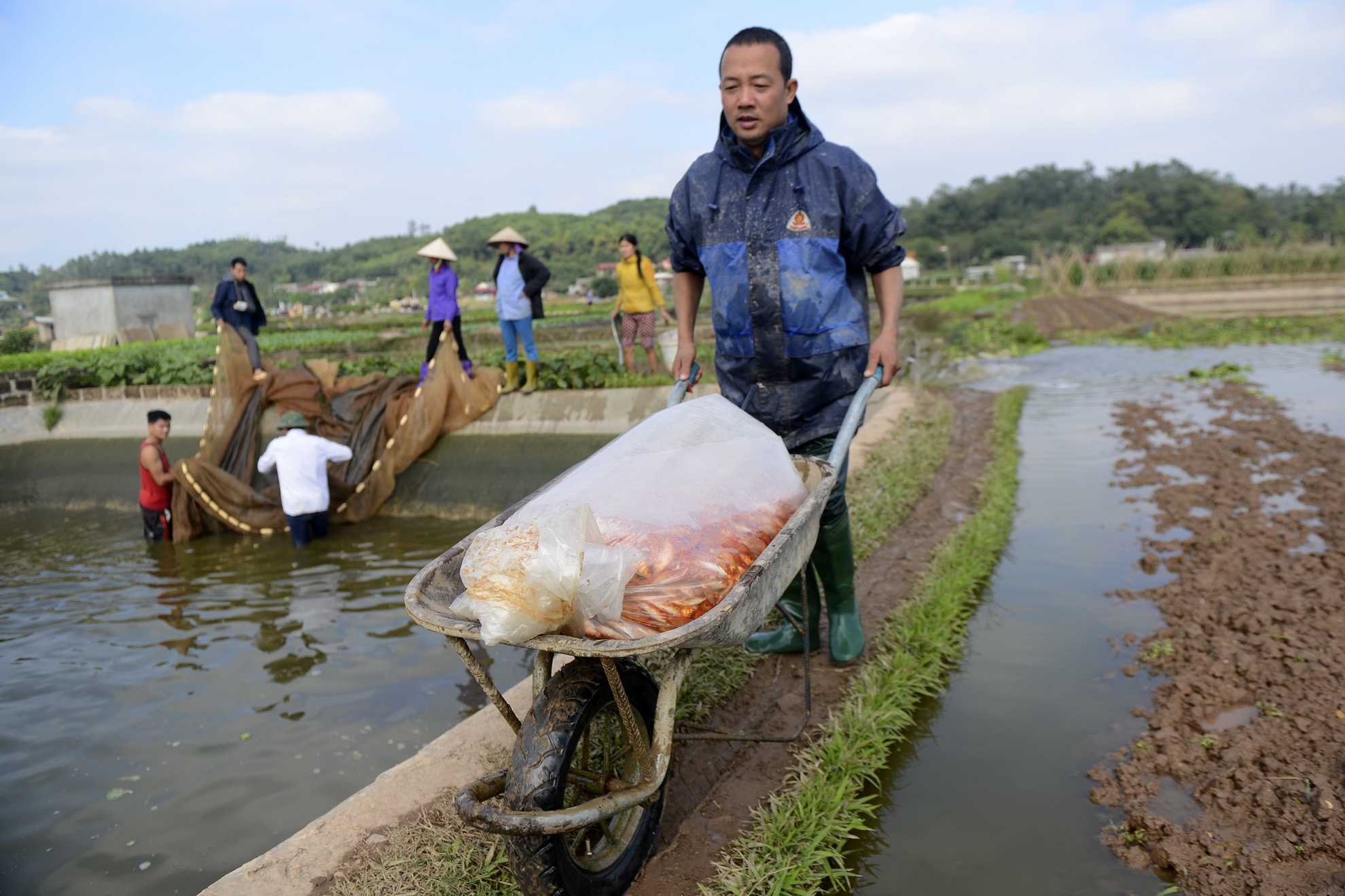 | Gia đình anh Thiện là một trong những hộ nuôi cá chép đỏ lớn nhất của làng. Chưa kể nhà ông bà, anh chị em trong nhà, riêng hai ao nuôi của anh đã thu hoạch được hơn 3 tạ cá. |