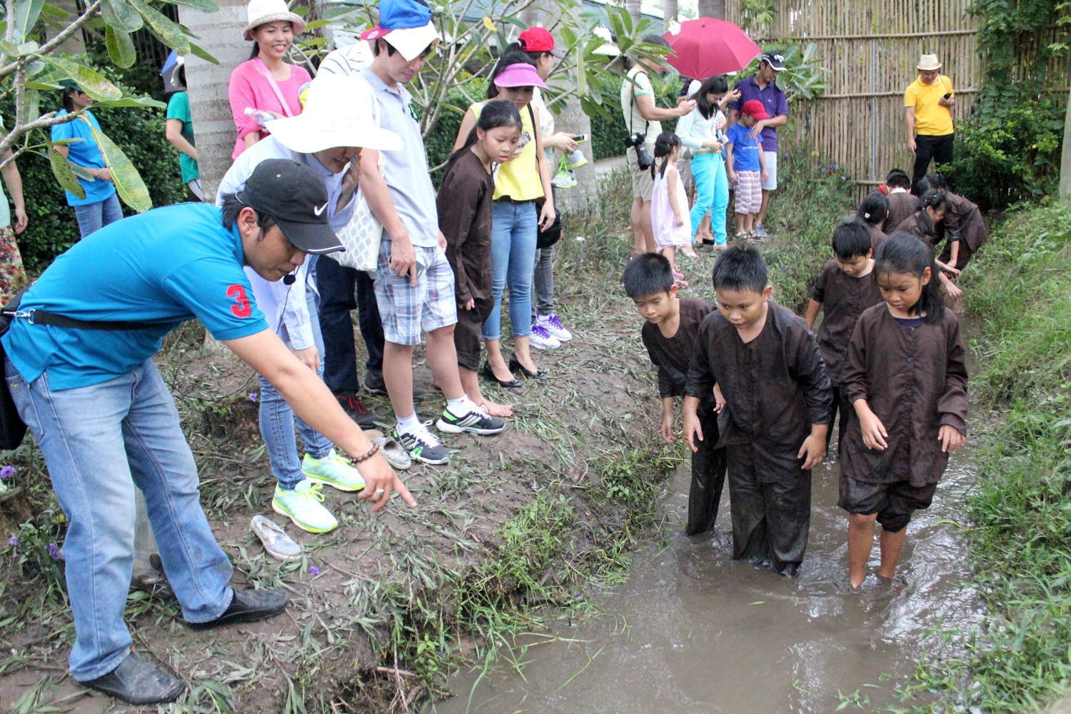 | TP HCM đã có nhiều dịch vụ cho khách trải nghiệm về công việc trồng trọt, nhưng đây là đơn vị đầu tiên tổ chức cho khách tự tay bắt cá, vắt sữa bò, chăn nuôi các loại gia súc. Với mức giá 395.000 đồng mỗi người, bao xe đưa đón, chương trình đã được nhiều gia đình đăng ký cho con trẻ trải nghiệm một ngày làm nông dân chính hiệu. Hơn chục con cá lóc được cho cho xuống một mương có ít nước. Khách sẽ được mặc áo bà ba, vào vai nông dân "chính hiệu" để bắt cá. |