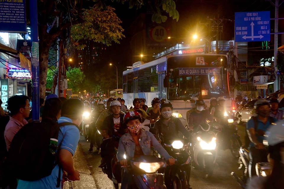 | 21h, giao thông trên đường CMT8 và một số tuyến đường giao cắt đã giảm nhiệt so với thời điểm vừa cấm xe. Lúc này đường Nguyễn Thị Minh Khai nằm trong vành đai cấm, nhưng lực lượng chức năng vẫn cho lưu thông để giải tỏa ùn tắc. |