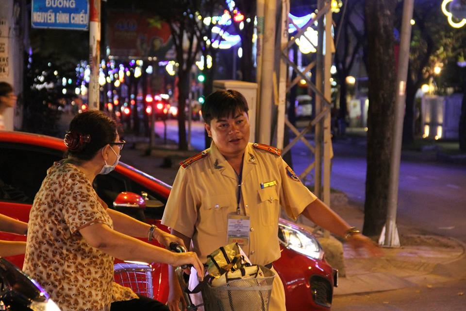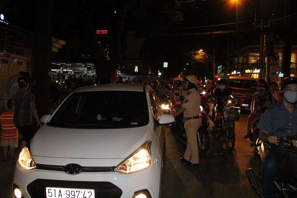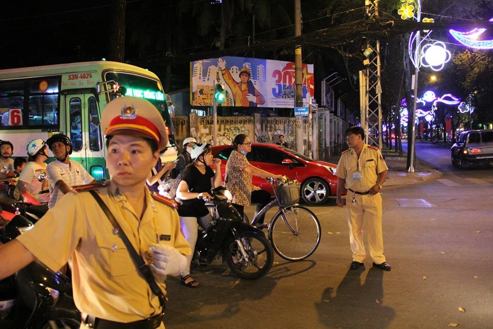 | 19h, tại ngã tư Hai Bà Trưng - Trần Cao Vân (quận 1, TP HCM), CSGT bắt đầu phân luồng, cấm xe lưu thông từ hướng Hai Bà Trưng về trung tâm quận 1. |