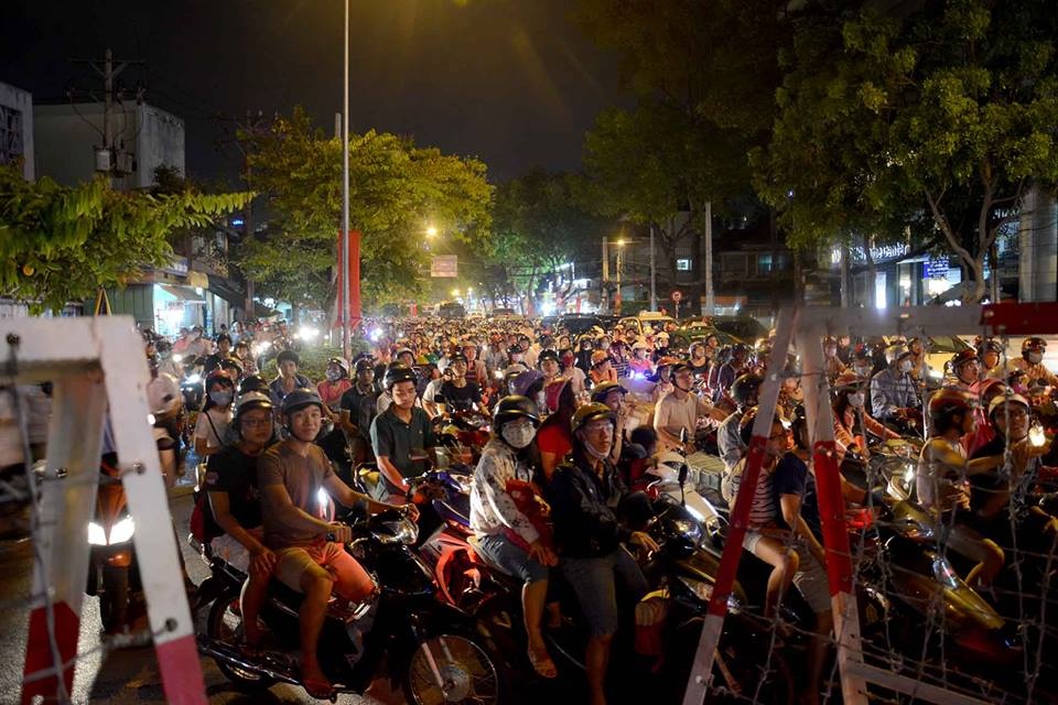 Vào 19h ngày 24/4, CSGT lập chốt cấm tất cả các phương tiện đi vào khu trung tâm quận 1, TP HCM. Các đường vành đai như CMT8, Nguyễn Thị Minh Khai bị ùn ứ nghiêm trọng.