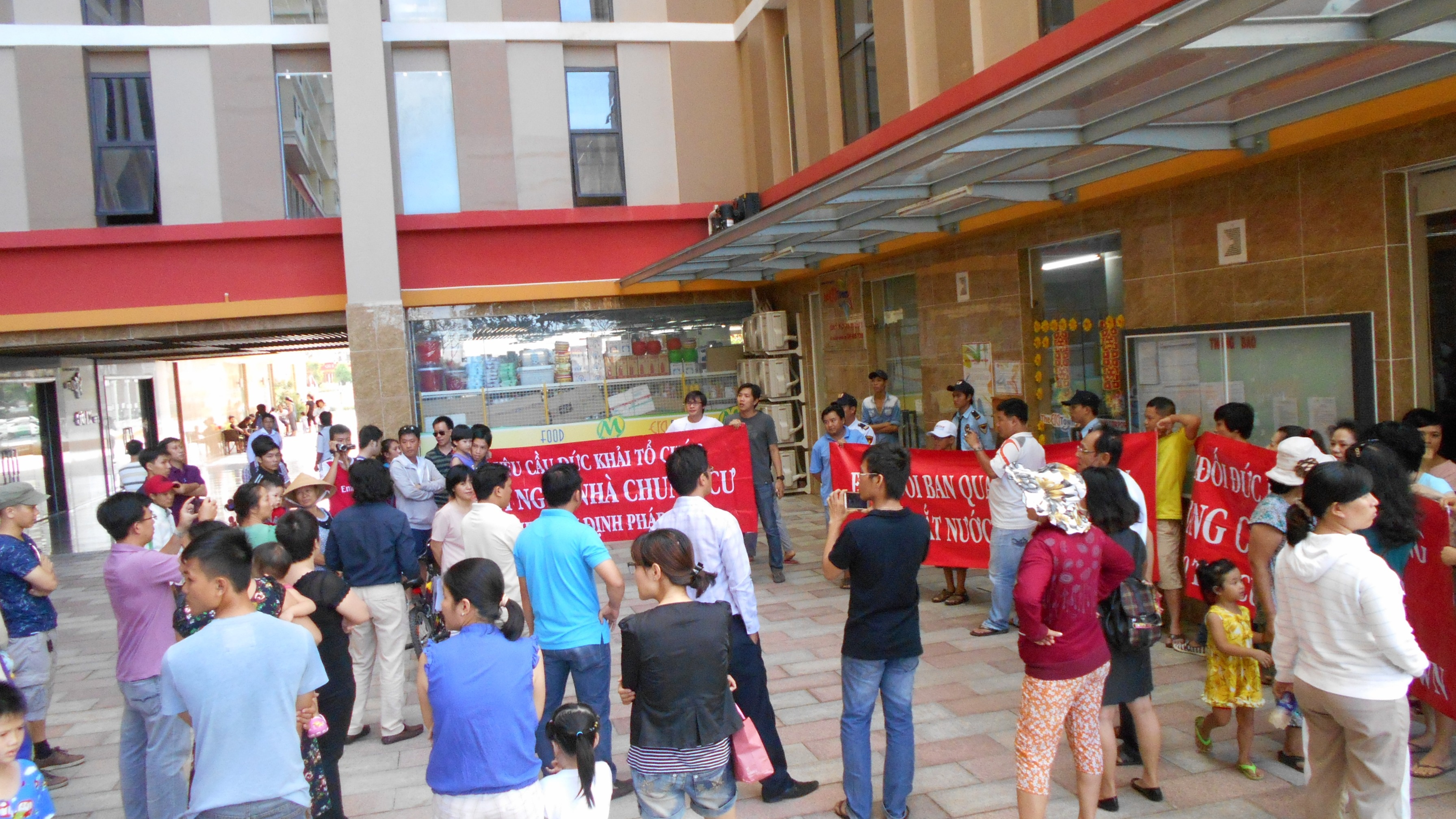 | Hàng chục hộ dân tập trung trước văn phòng BQL chung cư để phản đối việc cắt nước. Ảnh: M. Qúy |