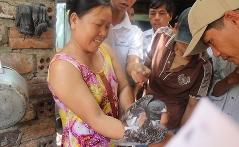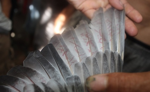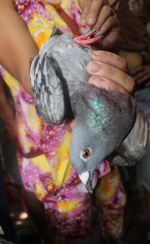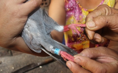 | Bà Tư cho biết: “Lúc cho chim bồ câu tôi nuôi tại vườn ăn thì phát hiện con chim lạ này, chân chim mang vòng nhiều màu sắc và trên 2 cánh có in kí tự giống chữ Hán”. |