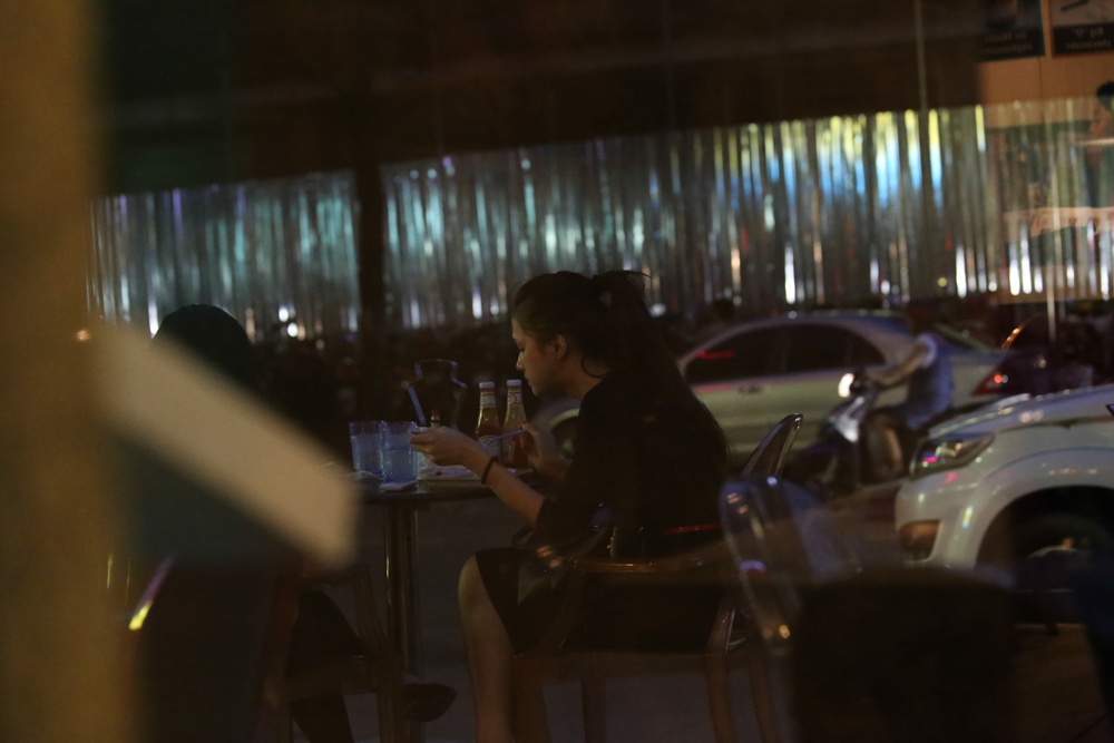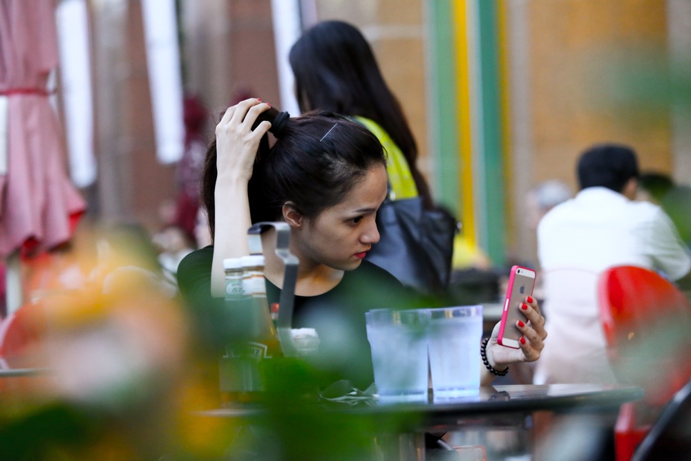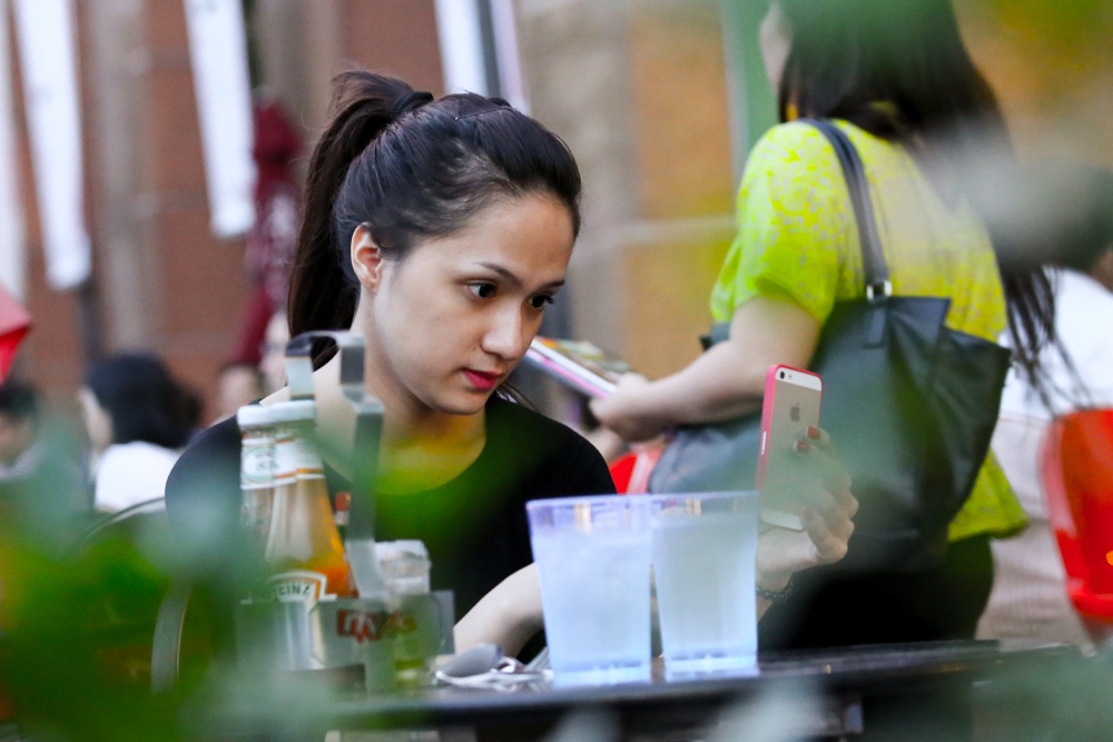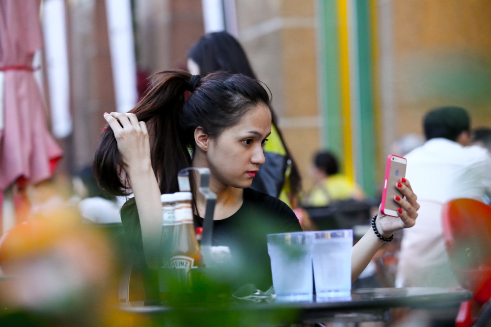 | Người đẹp chuyển từ khu vực bên trong ra ngoài đường để dùng bữa tối cùng bạn bè và tranh thủ đón gió chiều mát lạnh của TP.HCM. Hương Giang Idol sẽ có mặt ở Hà Nội vài ngày vì có lịch biểu diễn và kết hợp về thăm gia đình sau một thời gian dài Nam tiến lập nghiệp. |