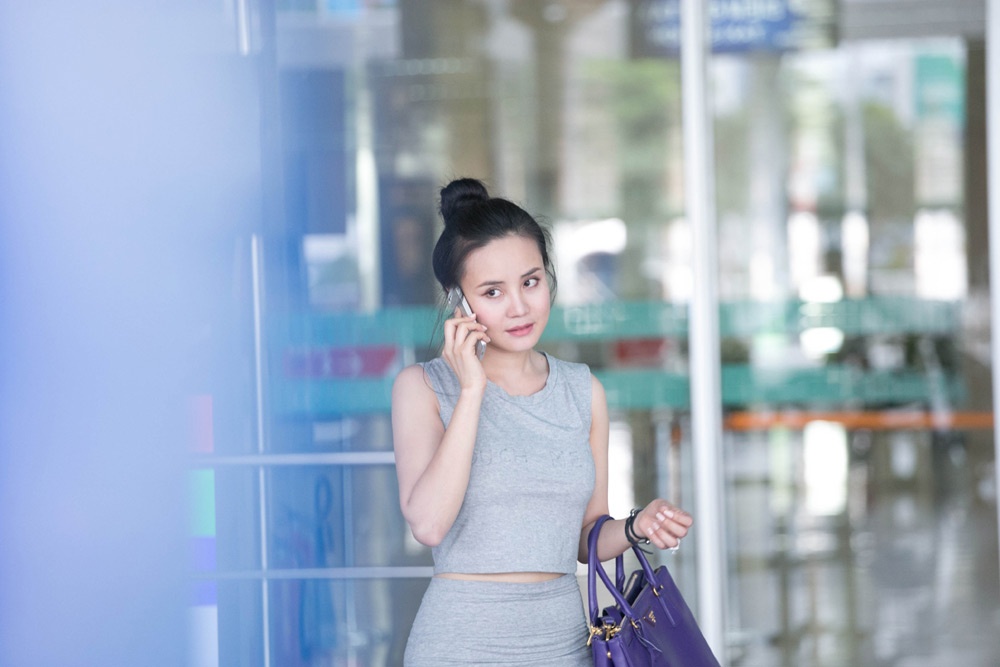 | Vy Oanh không ngừng liên lạc bằng điện thoại khi đi bộ trong sảnh sân bay. Cô tỏ ra khá sốt ruốt vì không gọi được người thân để làm thủ tục lấy hàng. |