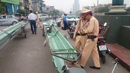 Ba chiếc xe máy trên biển kiểm soát Hà Nội và đều được lắp thanh giằng bằng sắt. Trên giá chở theo nhiều tấm tôn cồng kềnh dài hơn 10 m.