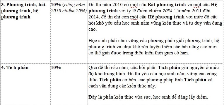 Theo phân tích của thầy, cô giáo thuộc bộ môn Toán, Trung tâm Hocmai.vn, từ năm 2010 đến 2014, cấu trúc đề thi đại học môn Toán không thay đổi nhiều. Sự điều chỉnh đáng chú ý nhất là bỏ phân loại phần riêng cho ban cơ bản và ban nâng cao năm 2014, tạo ra sự công bằng đối với thí sinh dự thi.