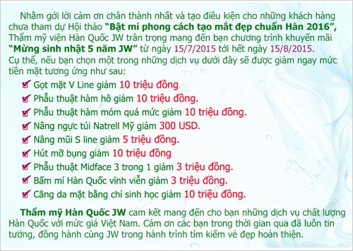 | Chương trình ưu đãi của Viện Thẩm mỹ Hàn Quốc JW tiếp tục được diễn ra từ ngày 15/7 đến 15/8 nhằm tạo điều kiện cho những người chưa tham dự hội thảo có cơ hội được làm đẹp với công nghệ chuẩn Hàn. |