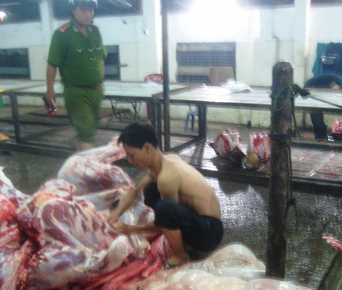 | Công an kiểm tra cơ sở giết mổ bò. |