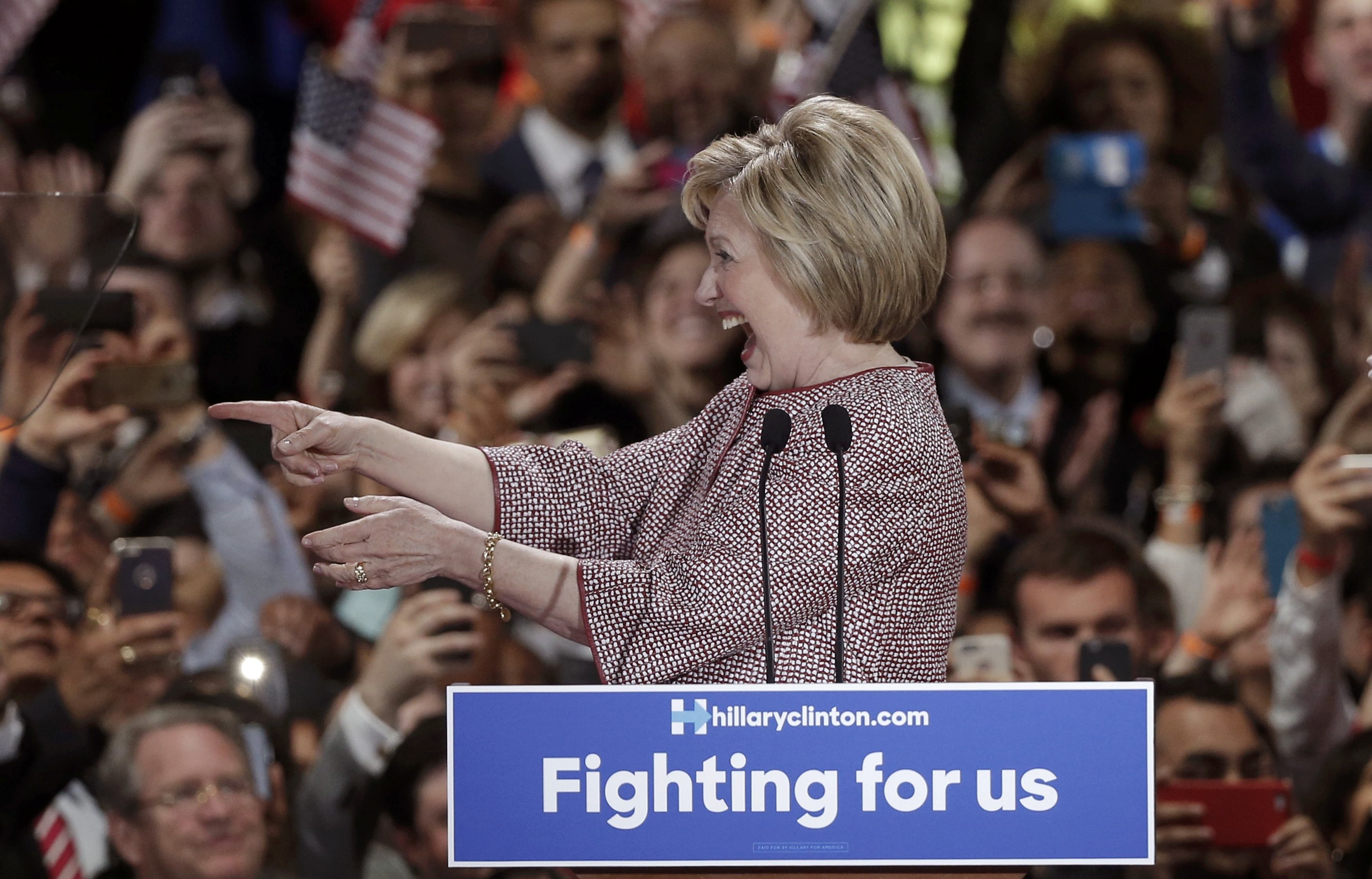 Bà Clinton ăn mừng chiến thắng trong bầu cử sơ bộ ở New York. Ảnh: Reuters |