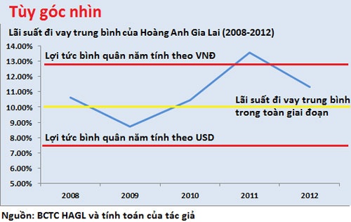 Kết quả, lãi suất trung bình HAGL phải chịu trong giai đoạn 2008-2013 là 9,9%, thấp hơn lợi tức tính bằng Việt Nam đồng, nhưng lại cao hơn lợi tức tính bằng Đôla Mỹ.