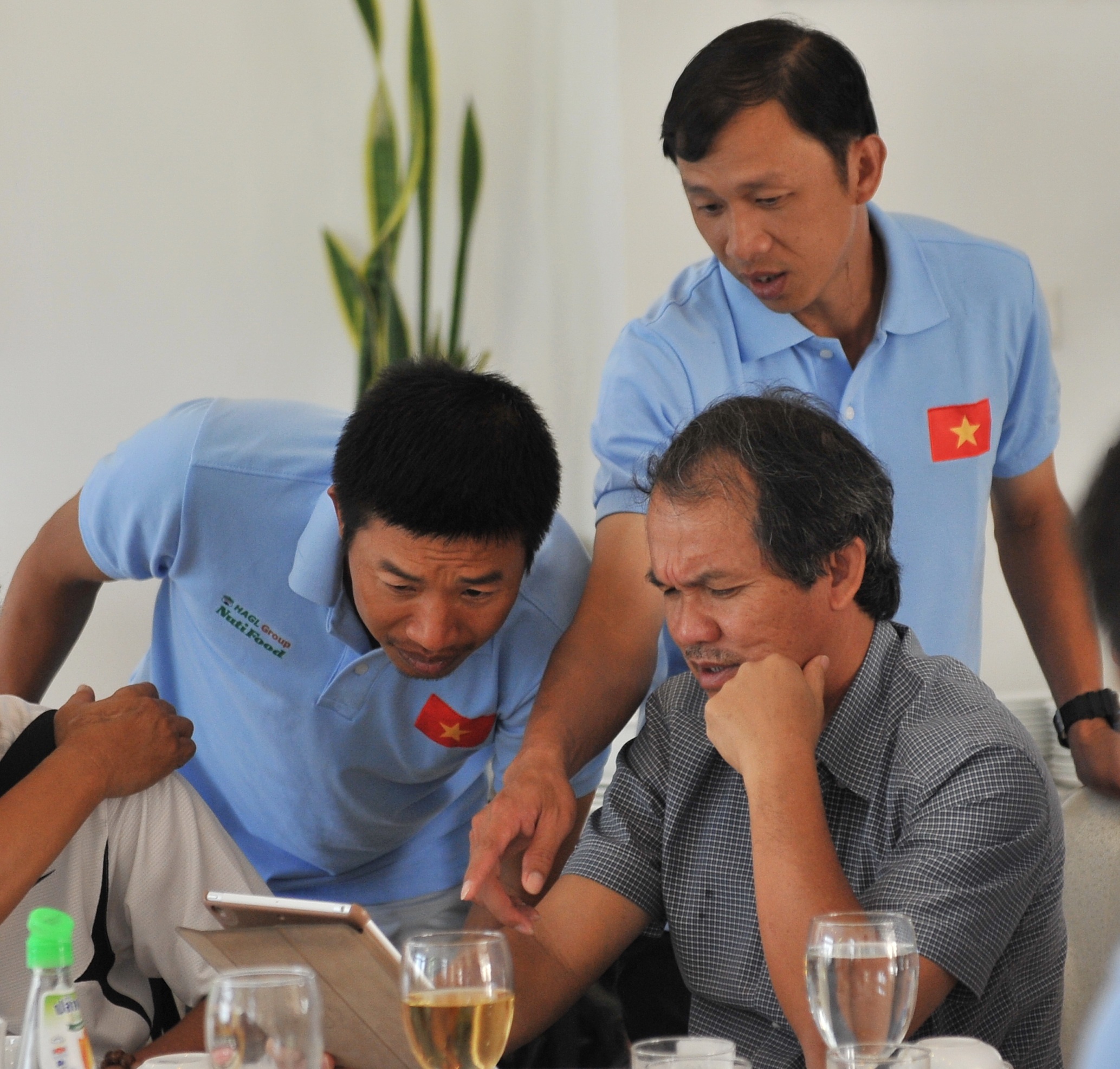 | Bầu Đức cùng BHL trao đổi về vấn đề chuyên môn của đội bóng trong bữa ăn sáng nay (10/10). |