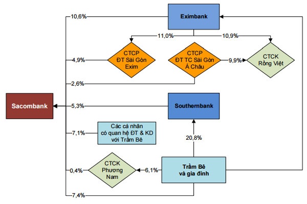 Sacombank sau khi được nhóm cổ đông, mà đứng sau là ông Trầm Bê thâu tóm, theo một báo cáo của ông Nguyễn Xuân Thành - Chương trình Giảng dạy Kinh tế Fulbright TP HCM, còn có cấu trúc sở hữu chéo phức tạp hơn nhiều, không chỉ liên quan tới các DN phi tài chính mà còn cả các NHTM khác.