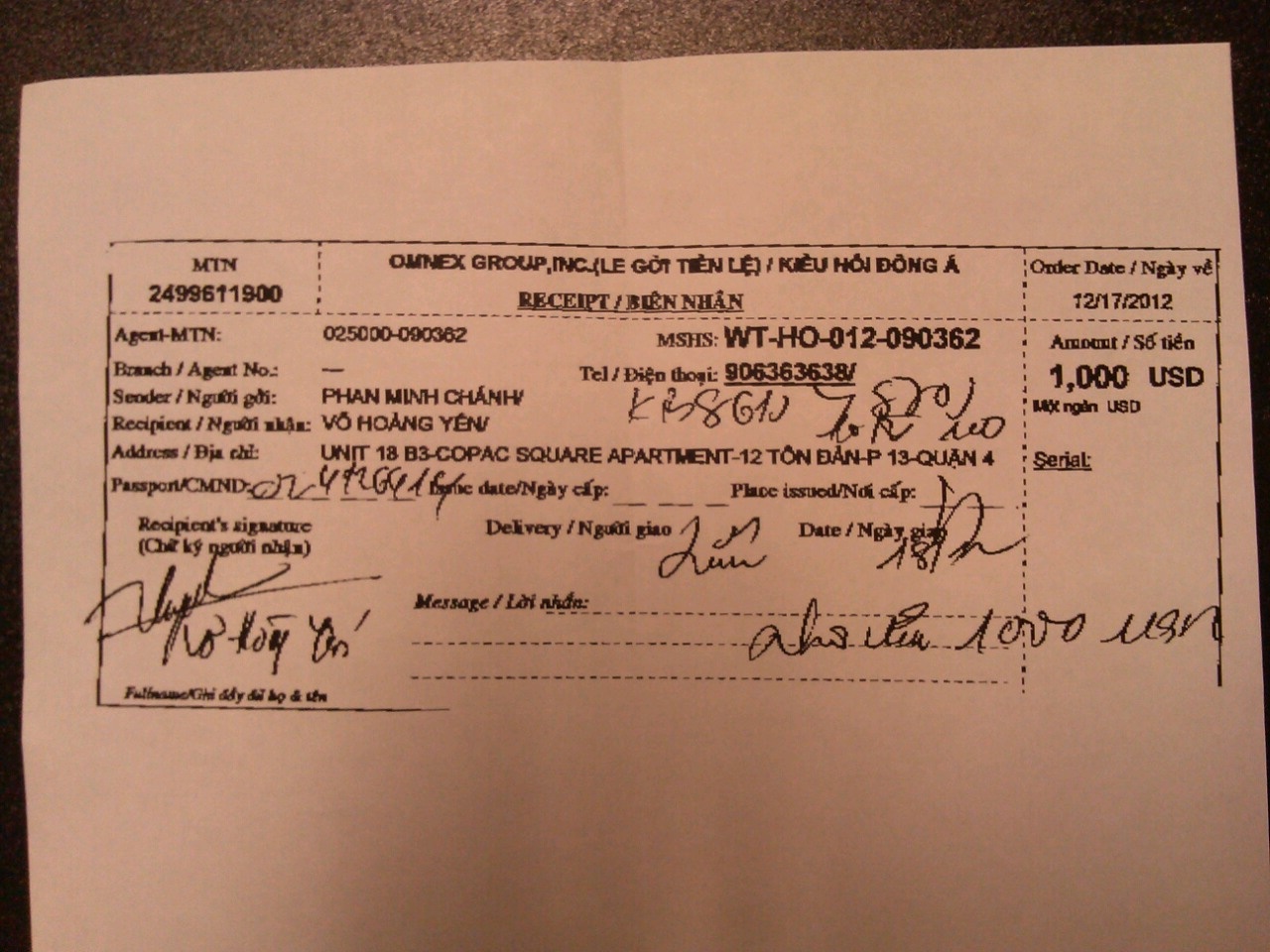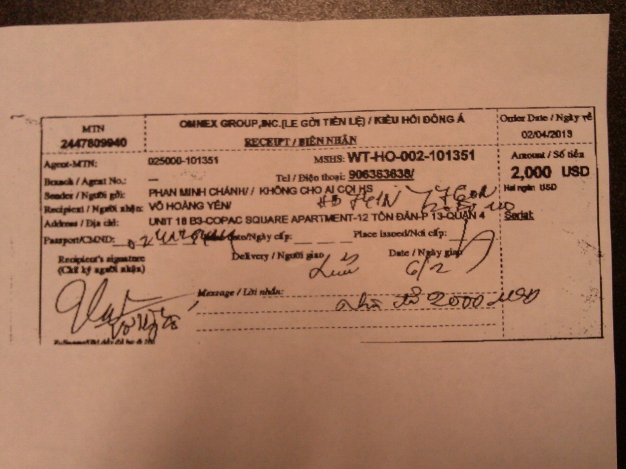 | Những chứng từ Minh Chánh từng gởi tiền cho Hoàng Yến. |