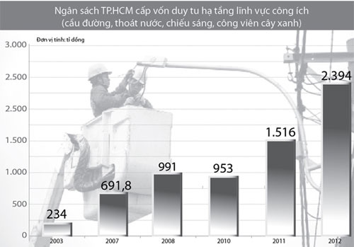 Năm 2012, ngân sách TP.HCM cấp vốn duy tu hạ tầng giao thông cho các lĩnh vực công ích là 2.394 tỷ đồng. Trong đó cấp cho Sở Giao thông vận tải 1.893 tỷ đồng, gồm duy tu cầu 185 tỷ đồng, đường 533 tỷ đồng, chiếu sáng 626 tỷ đồng, cây xanh 487 tỷ đồng, đường thủy 30 tỷ đồng... Cũng trong năm này, ngân sách cấp vốn duy tu cho ngành thoát nước 501,6 tỷ đồng (bắt đầu từ năm 2009, vốn duy tu thoát nước được bàn giao từ Sở Giao thông vận tải về Trung tâm Điều hành chương trình chống ngập nước thành phố quản lý).