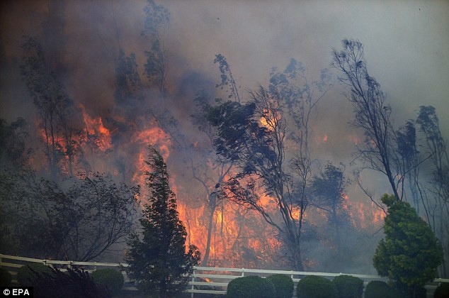 | Hàng loạt cây bốc cháy khi lửa lan rộng. Giới chức thông báo lửa thiêu rụi khoảng 30 nhà trong ngày 14/5. Ảnh: EPA |
