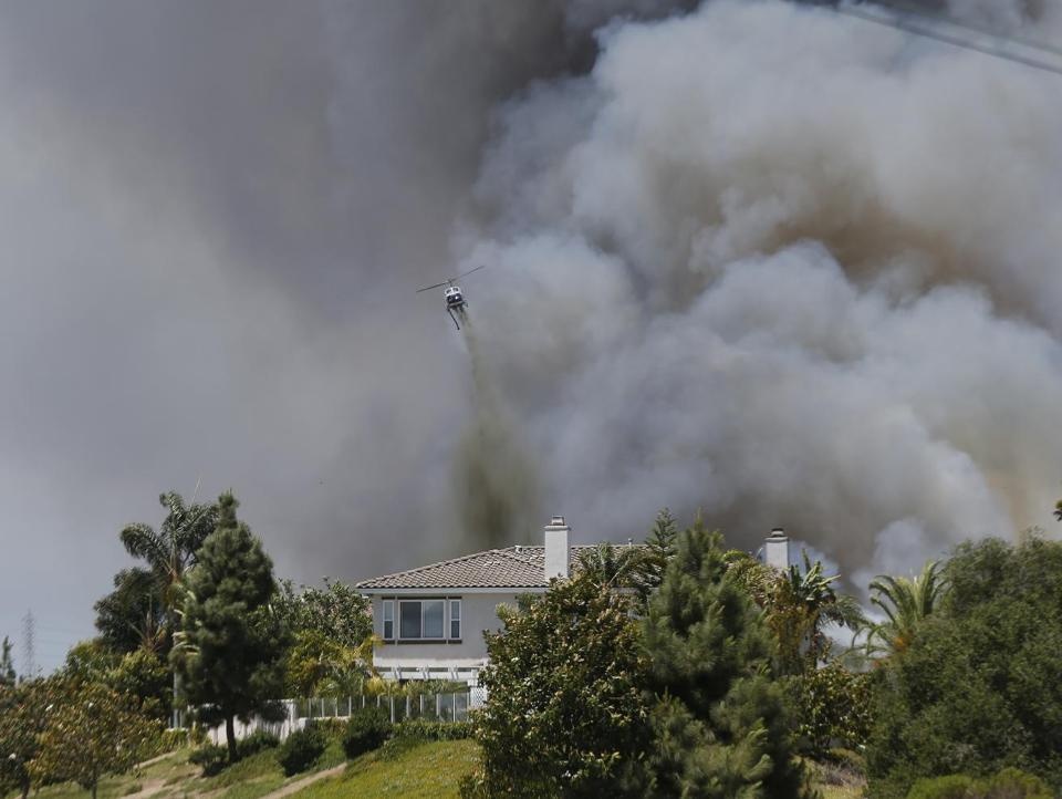 | Trực thăng thả hóa chất chống cháy xuống một khu vực ở thành phố Carlsbad, bang California hôm 14/5. Những đám khói đen khiến bầu trời Carlsbad trở nên tối sầm. Ảnh: AP |
