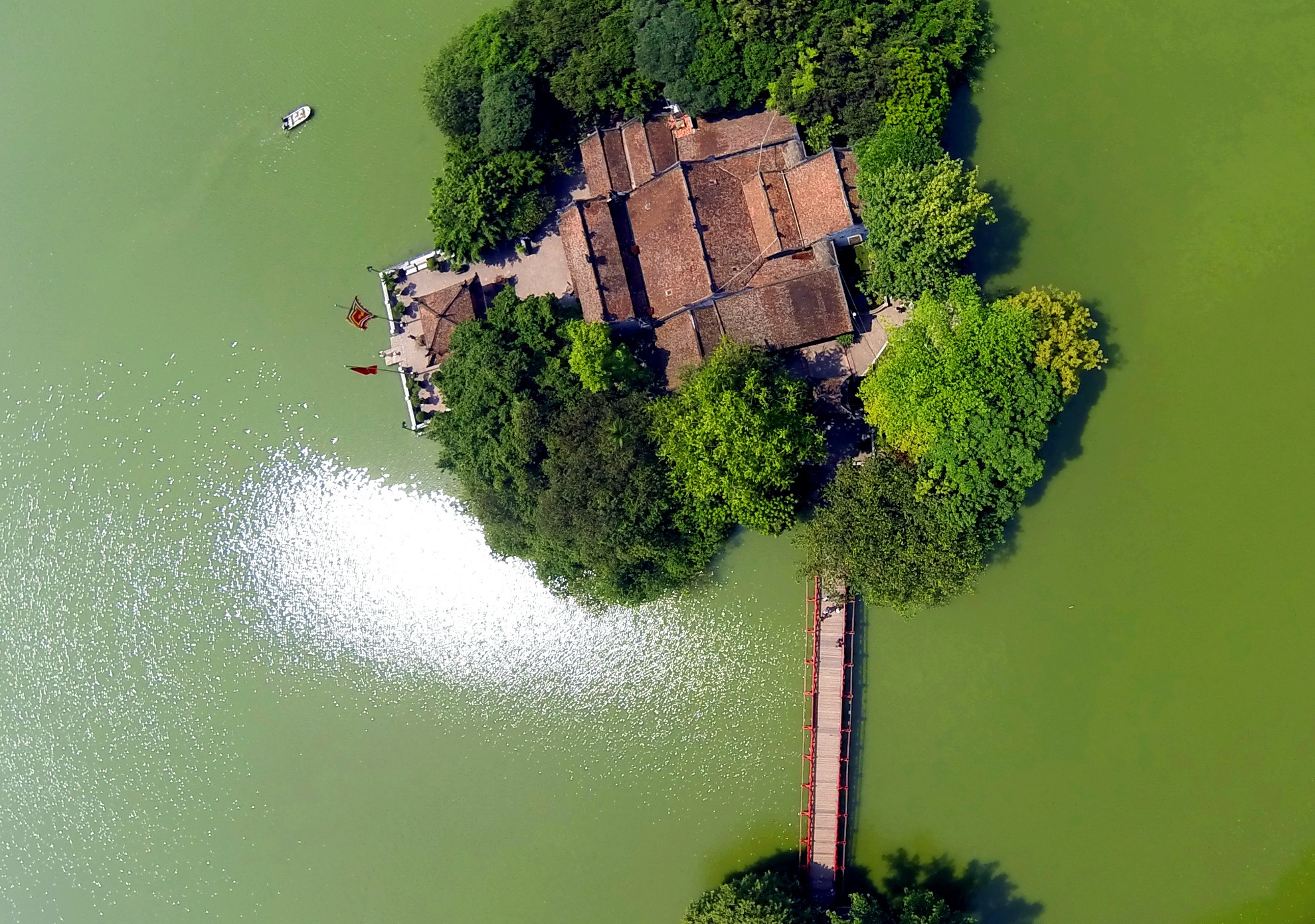 | Ngoài ra, trên hồ còn có đền Ngọc Sơn nằm trên đảo Ngọc Sơn, nối với bờ là cầu Thê Húc cong cong mầu đỏ thắm. |
