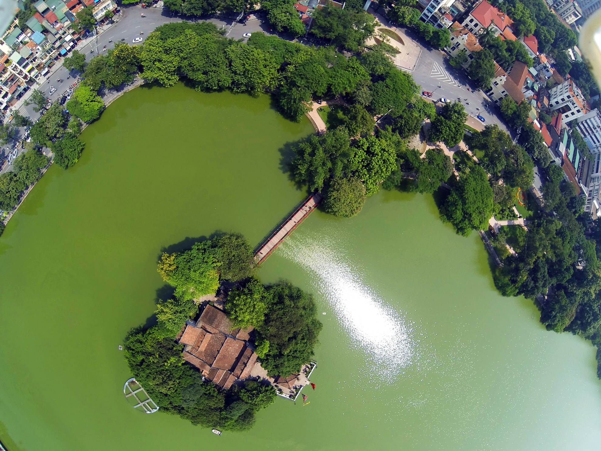 | Hồ Hoàn Kiếm (hay còn gọi là hồ Gươm) nằm ở trung tâm thủ đô, kết nối với khu phố cổ do người Pháp quy hoạch cách đây hơn một thế kỷ. |