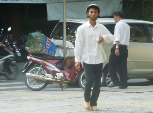 | Sau khi ném hết số chim vào chiếc lồng chở trên xe máy đậu trên lề đường Trần Phú cách đó vài chục mét. |